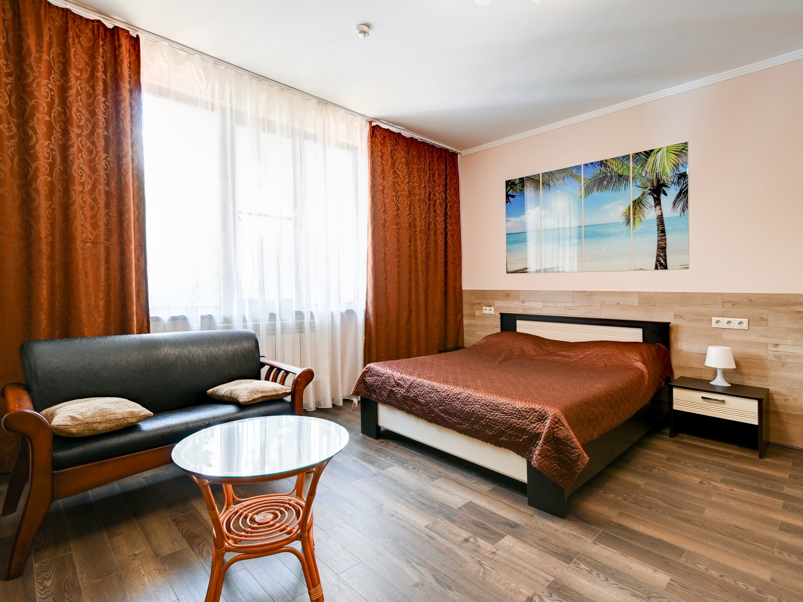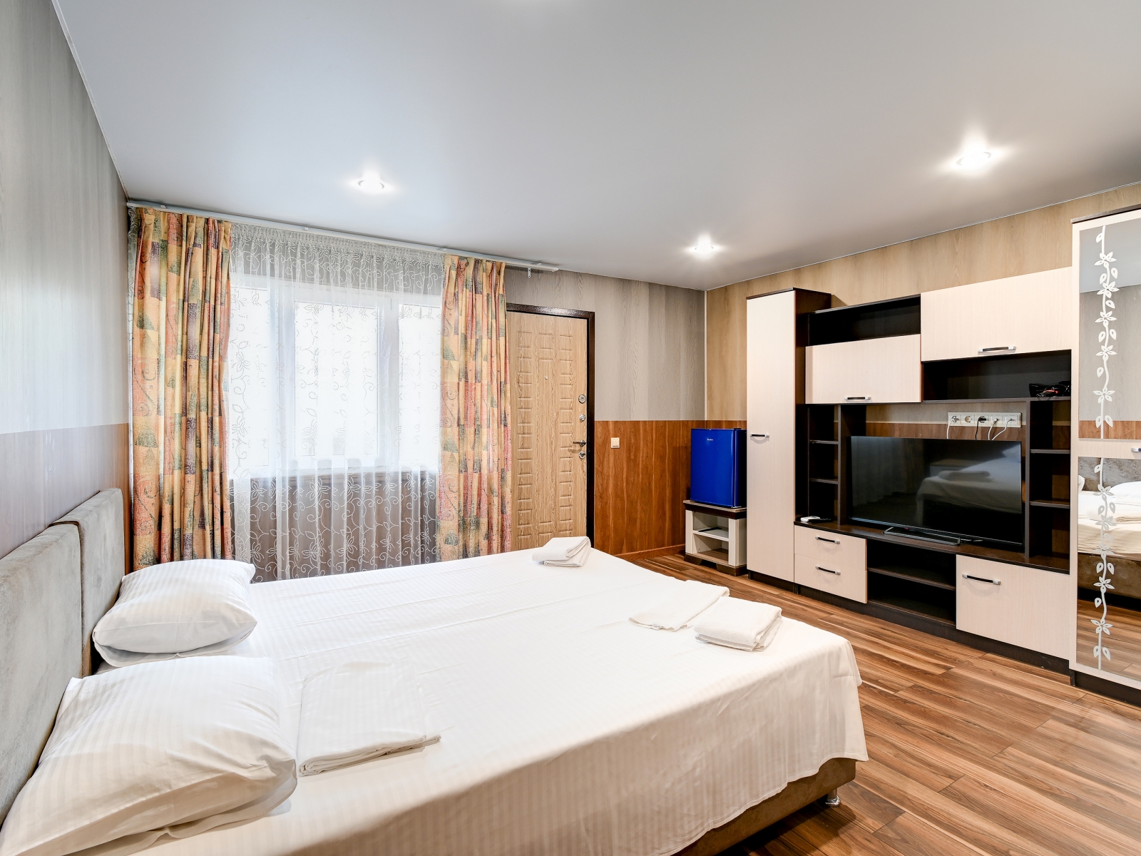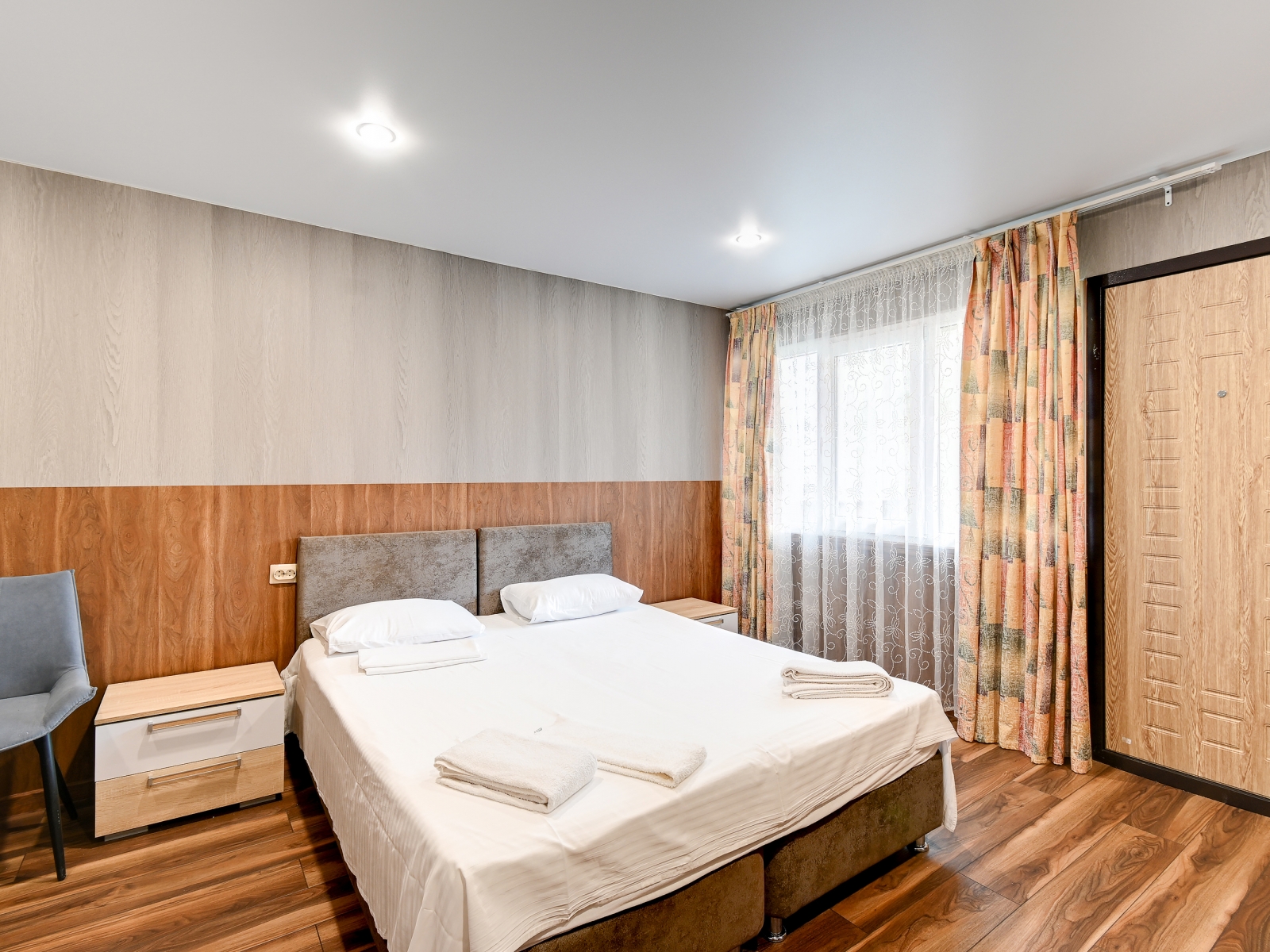 Номер категории «Двухместный стандарт» — Стандартные двухместные номера в нашем гостевом доме оборудованы всем необходимым для комфортного проживания. В каждом номере установлены плоские телевизоры 40" со спутниковым телевидением, современные инверторные сплит системы тепло/холод, двухспальные кровати стандартного размера 160*200. В каждом номере имеется холодильник, чайник с чайными принадлежностями и фен. Совмещенная душевая и туалетная комнаты выполнены из керамогранита и оснащены всем необходимым.