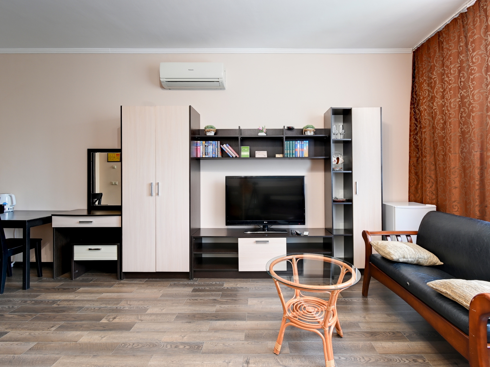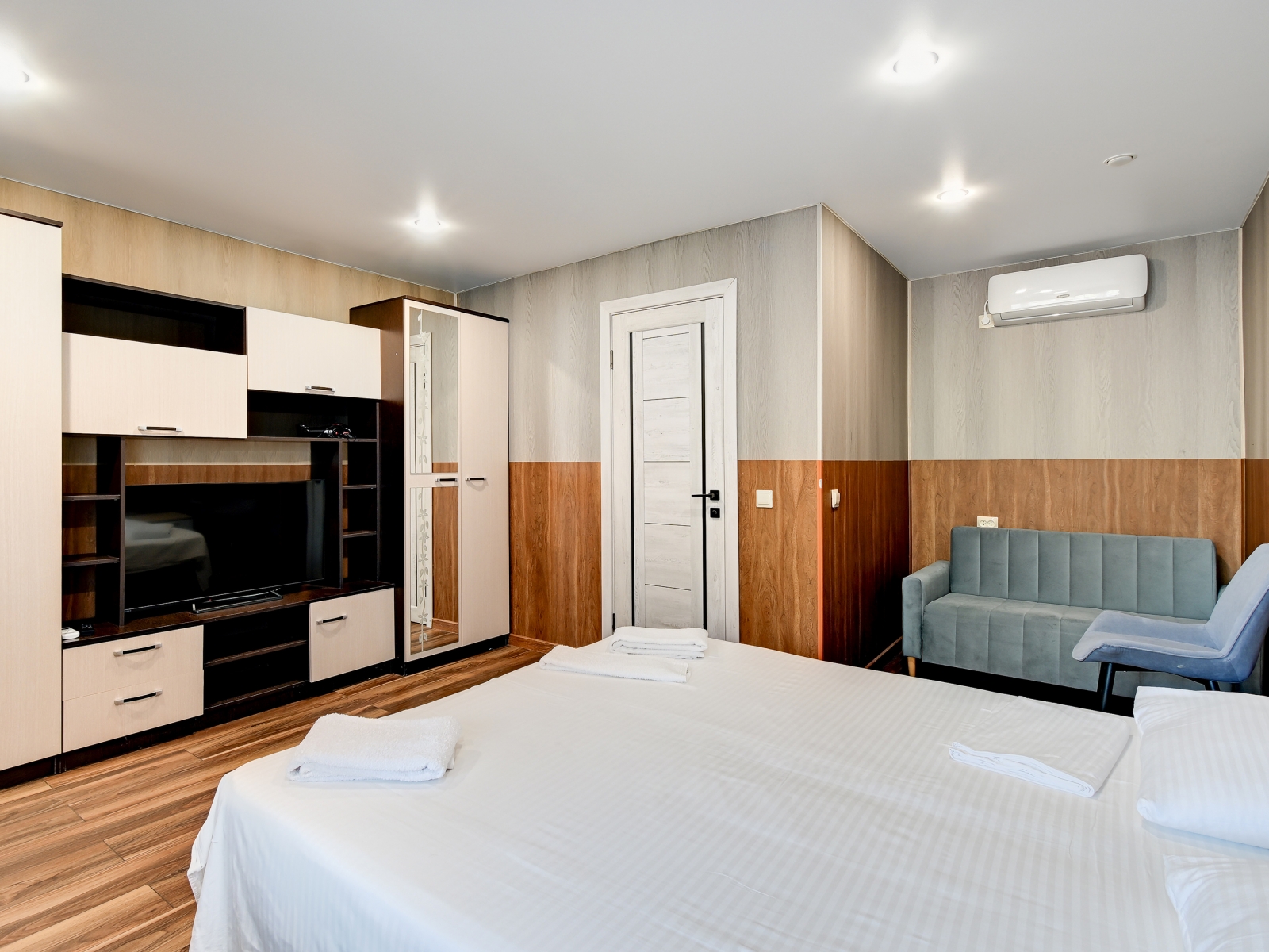Стандартные двухместные номера в нашем гостевом доме оборудованы всем необходимым для комфортного проживания. В каждом номере установлены плоские телевизоры 40" со спутниковым телевидением, современные инверторные сплит системы тепло/холод, двухспальные кровати стандартного размера 160*200. В каждом номере имеется холодильник, чайник с чайными принадлежностями и фен. Совмещенная душевая и туалетная комнаты выполнены из керамогранита и оснащены всем необходимым.